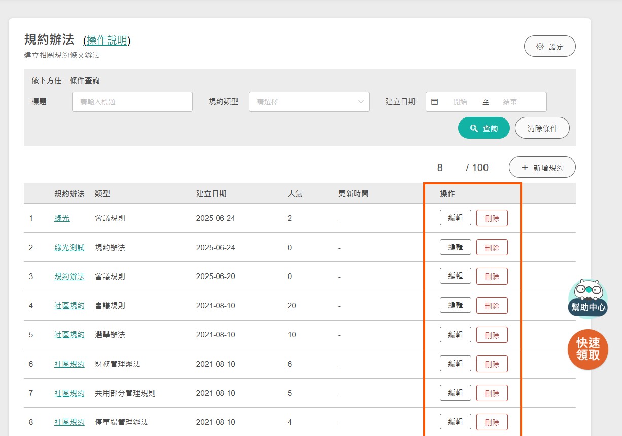 已上傳之規約將顯示於規約辦法列表,日後可隨時至此查看、編輯與刪除規約。