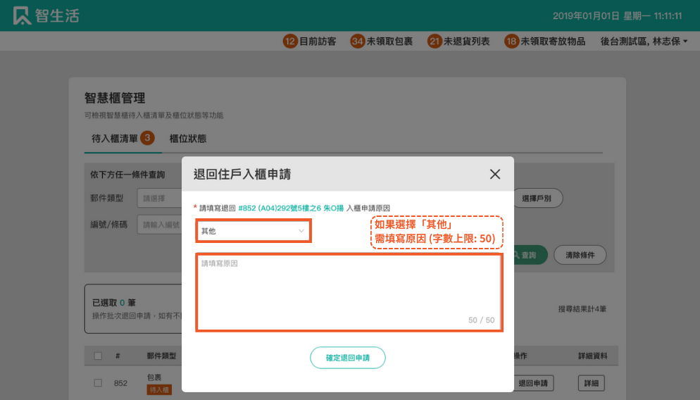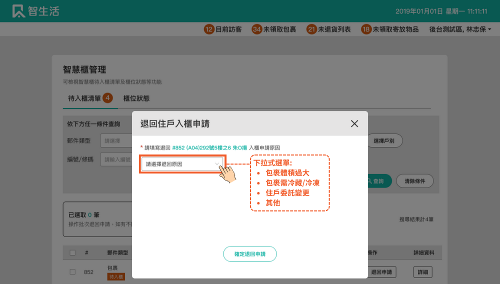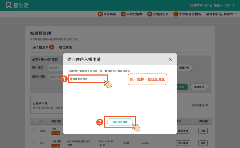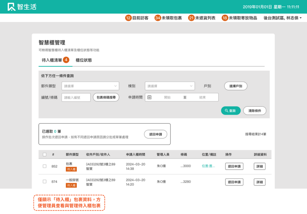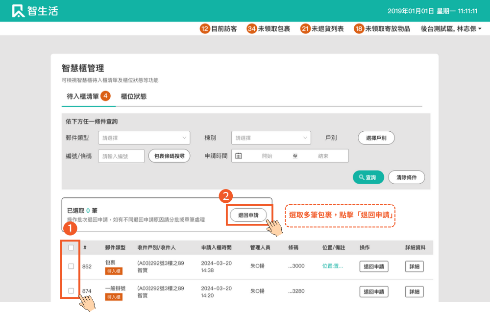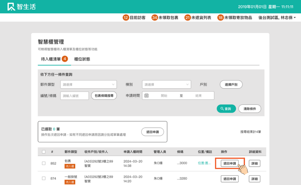 步驟1:於「待入櫃清單」點擊「退回申請」